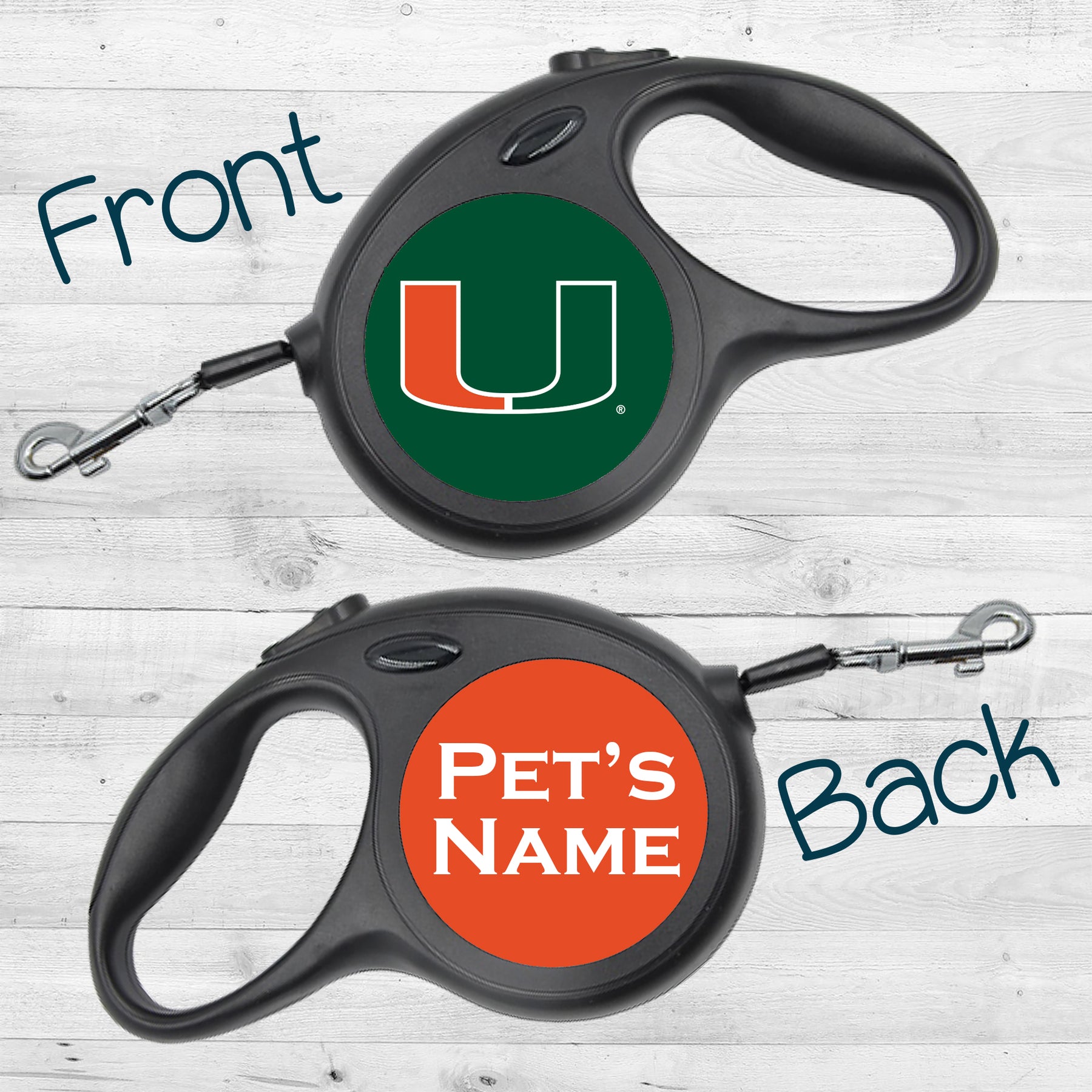 Made for your dog, our customized Miami Hurricanes NCAA retractable leash is a great way to keep your pet safe and feeling loved. Our durable design is designed to hold up to damage from weather, water, and any ruff-housing! Officially Licensed NCAA leash to make your companion game-day ready! This leash is for pets up to 35 pounds and is personalized with your pet’s name.